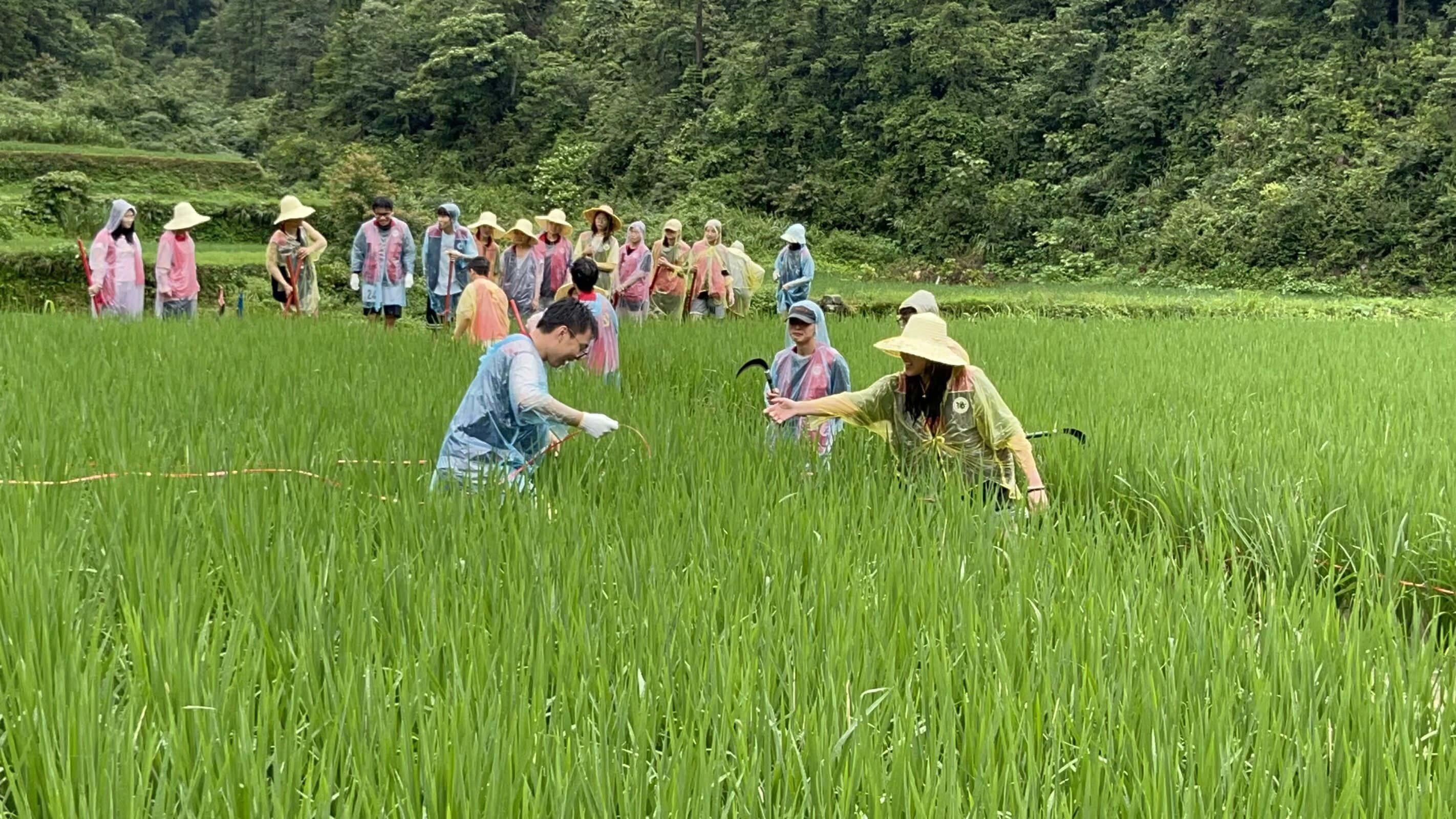 第四天, 开展了和美乡村活动,同学们在老师和村支书的带领下,来到了拥党村村寨,将同学们手绘的簸箕画用来装饰寨子,这不仅有利于促进村寨的“和美乡村”建设,同时也表达了对拥党村的美好祝福。之后,在村支书的带领下,同学们去到村民家里,宣讲养老保险政策并对其人居环境卫生情况进行了打分评比,评选出了“示范户”并为他们颁发了奖品。此外,同学们争取以沟溜式养鱼为农民们增收,雨后田间同学们身着雨衣,挽起裤脚,在稻田里拉线画道、割稻开沟、运稻清沟,就沟溜式稻鱼综合种养模式进行下田实践,并成功帮助拥党村完成两块稻田的该模式建设,正式进行了沟溜式养鱼。同学们的欢声笑语回荡在湿润的空气中,也成为了本次宝贵经历的快乐之音。