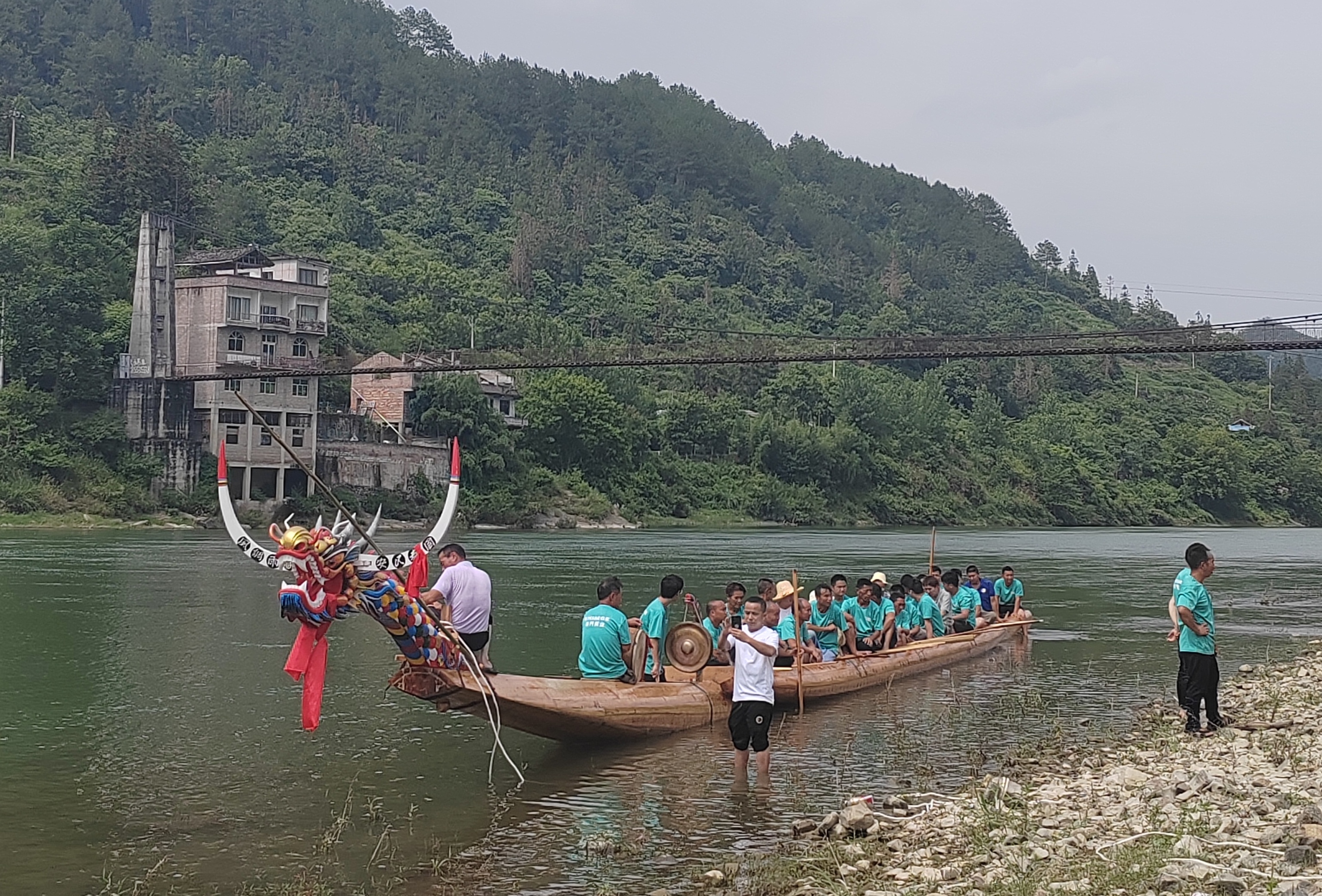 随后,在梁任敏老师的带领下走访村落,遇到了正在清水江中备赛的独木龙舟训练队,村民们看到梁任敏老师都亲切的打招呼:“梁书记您来看我们训练啦!”。6月底是台江“苗族独木龙舟节”,平兆村是独木龙舟四年冠村,每年这个时候,村里的中年男子会不约而同从全国各地返回村里备赛,伴着整齐的号子和鼓声,队员们整齐划一的挥动船桨快速划水,龙舟快速的驶离岸边。