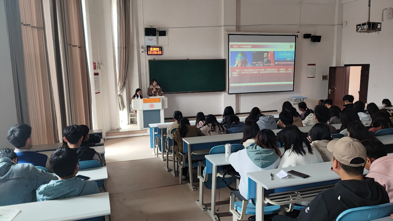 首先,由彭梦娜老师为同学们领学《高举中国特色社会主义伟大旗帜为全面建设社会主义现代化国家而团结奋斗》-在中国共产党第二十次全国代表大会上的报告。随后,杨姿婧同学进行宣讲,她从党的二十大报告对经济建设、教育科技人才工作、民主政治建设文化建设等做出的部署为大家进行了讲解。随后,各班员工代表进行了交流发言。